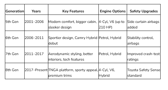 The Camry Hybrid gained popularity around this time due to its improved mileage and reduced pollution, which benefited the environment. This generation made the Camry’s reputation as a practical yet forward-thinking midsize car even stronger because it blends better performance, new features, and environmental responsibility.